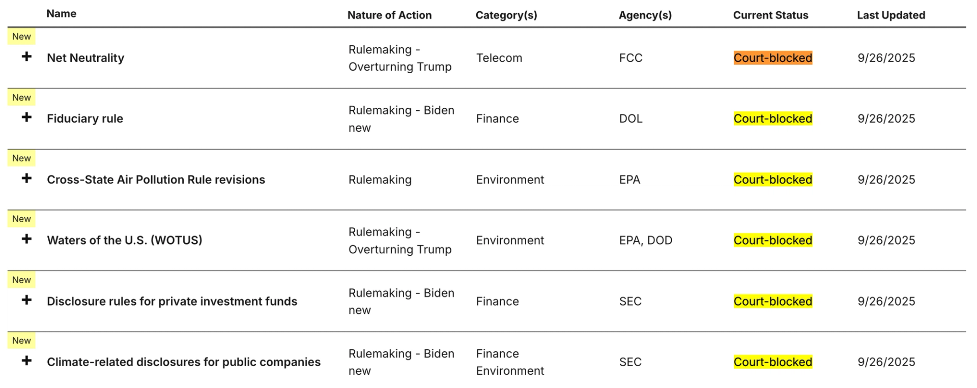 - This image, from Brookings Institution’s regulation tracker, shows the court-imposed limits of Trump’s stabs at traditional rule-writing. His success rate on Oval Office displays is far higher.