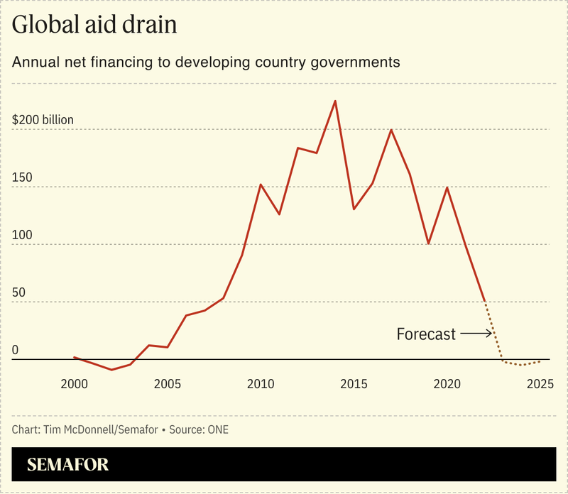 But far more important is a worsening debt pile in developing nations. Last year, for the first time in two decades, developing country governments became net contributors to international finance flows, because they collectively paid more to service debt held by other governments, development banks, and private lenders than they received in new loans and development aid, according to a report last week by the advocacy group ONE. This year, the report projects, developing countries will lose $50 billion on net, because of debt repayments.