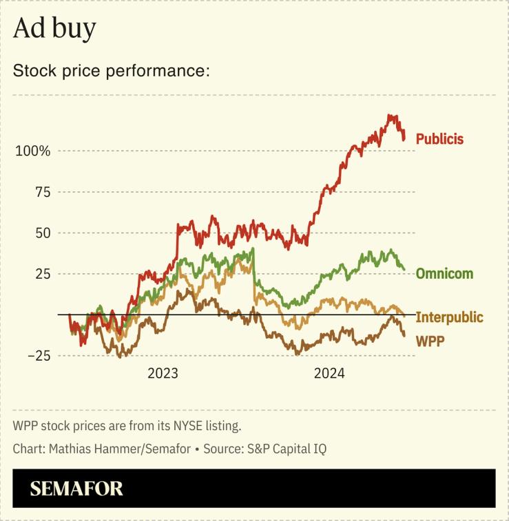 Now, six years later, Publicis appears to have delivered on its promise. The company’s stock performance has separated dramatically from its peers since 2020, a shift that reflects its success winning clients and an industry confidence it can keep doing that. Dentsu and the other key companies in the space find themselves chasing the Groupe.