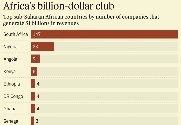 Out of the 345 companies in Africa that each generate $1 billion or more in annual revenues, 230 were started in an African country and the founder is often an African, according to a report by McKinsey. South Africa is by far the continent’s leader with 40% of all the billion-dollar revenue companies. Its large companies increased revenues at an average rate of 5.5% a year between 2015 and 2021, while large companies in other countries saw average declines by 1.7% in the same period.