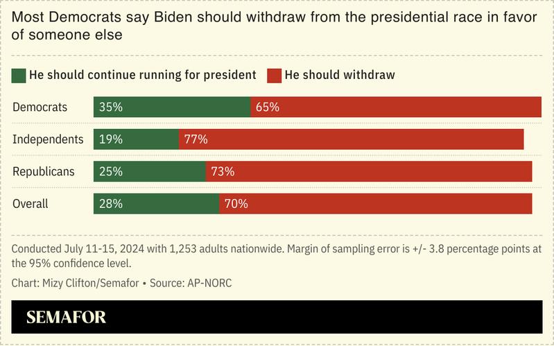 Nearly two-thirds of Democrats say US President Joe Biden should step aside and let the party nominate a different candidate to face Donald Trump in November, according to an Associated Press poll released Wednesday. Overall, 70% of those polled said Biden should bow out of the race. Among Democrats, the number was 65%, compared with 73% among Republicans.