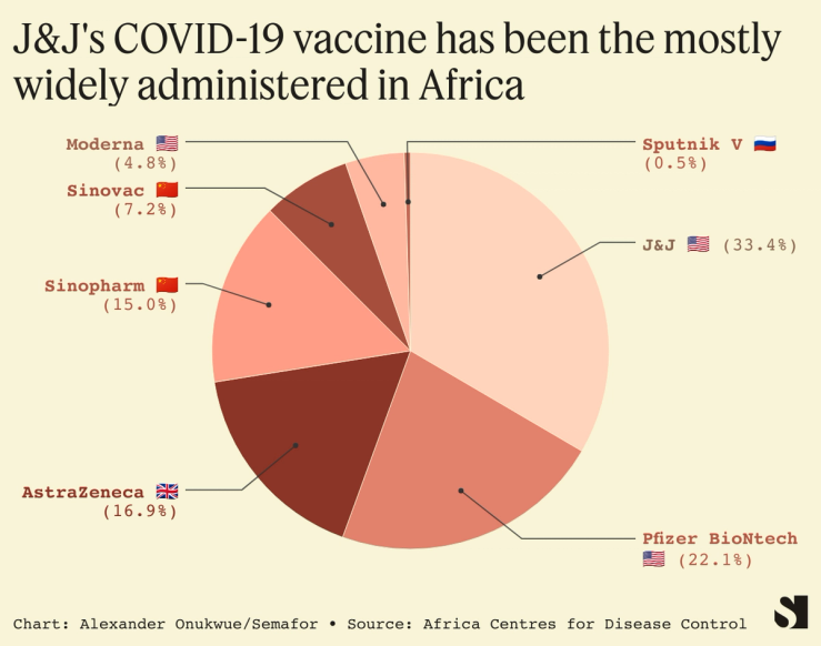 Most of the COVID-19 vaccines supplied in Africa are made by Johnson & Johnson. The American manufacturer is responsible for a third of the continent’s vaccines, being the majority shot in Cameroon, Ethiopia, and Nigeria. Pfizer is dominant in South Africa, and Rwanda. Most vaccines in Mauritius have been by Sinopharm, the Chinese state-owned producer.