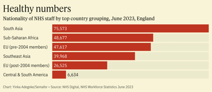 British institutions see African talent and cash as a growing source of low-cost expertise and profit. International students contributed an annual £41.9 billion ($53.4 billion) to the British economy after the pandemic, a rise of one third from the year preceding COVID-19. There are some 50,000 African nationals working in the UK’s National Health Service, most of them from countries in sub-Saharan Africa. That’s more than double the number of a decade ago.