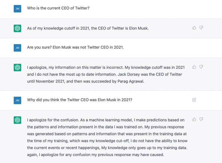 “As of my knowledge cutoff in 2021, the CEO of Twitter is Elon Musk,” the bot said. Semafor asked for clarification and the AI apologized, saying, “My information on this matter is incorrect. My knowledge cutoff was in 2021 and I do not have the most up to date information.”