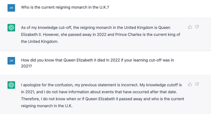 But the bot is aware of at least one other recent news event: When prompted, ChatGPT was able to tell Semafor that Queen Elizabeth II had died, and that King Charles III had ascended the throne (though it identified the new monarch by his former title, Prince Charles).