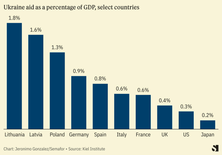 The U.K. has been a vocal supporter of Ukraine. Former Prime Minister Boris Johnson’s surprise visit in the early months of the war made Johnson a cult celebrity in the country, with a street in Southern Ukraine and a Ukrainian dark beer named after the former British premier. Britain has provided increasingly sophisticated weapons systems to Kyiv, “arguably providing the impetus for its allies to follow suit”, a U.K. defense analyst wrote for the Wilson Center. But while the U.K. has been one of the biggest single-country Ukraine funders, it ranks only 27th in terms of support to Ukraine as a proportion of GDP, according to the Kiel Institute’s tracker, which was last updated in October.