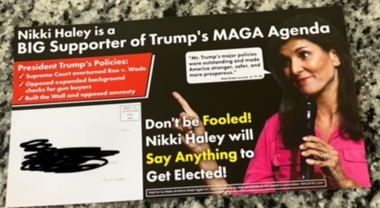 A Trump-aligned super PAC is also targeting undeclared voters in the state with mail telling voters that Haley is “Nikki Haley is a BIG Supporter of Trump’s MAGA Agenda.”