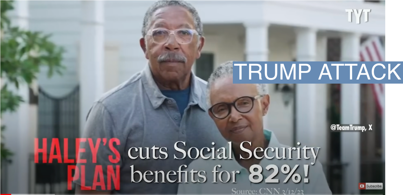 “Haley’s plan cuts Social Security benefits for 82% of Americans,” the advertisement’s narrator says over images of diverse, concerned-looking people. “Trump will never let that happen.”