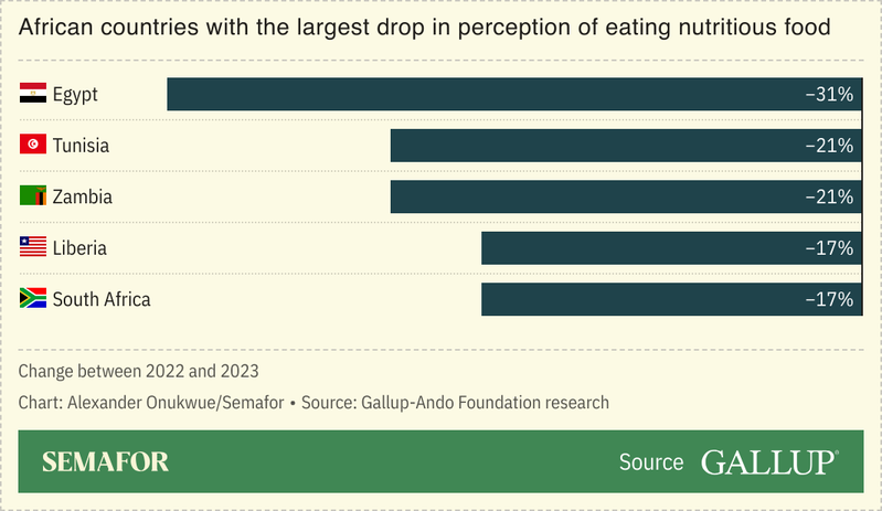 The share of respondents from North Africa who reported the food they ate was healthy in a given week fell from 75% in 2022 to 54% in 2023, global research by the Gallup-Ando Foundation found, the largest decline of all 11 regions surveyed. Perceptions of healthy eating in sub-Saharan Africa also dropped from 67% in 2022 to 60% in 2023.