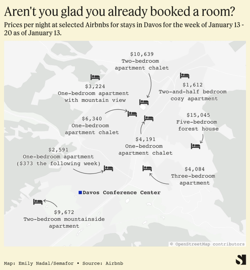 Crypto: Blockchain, that is. The industry’s laser eyes are focused on finding problems to solve, from carbon credits to AI to finance, and their deep roots in Switzerland helped them buy out much of Davos’s promenade, to the mild chagrin of event organizers. The last crypto golden boy left standing, Circle’s Jeremy Allaire, is in attendance.