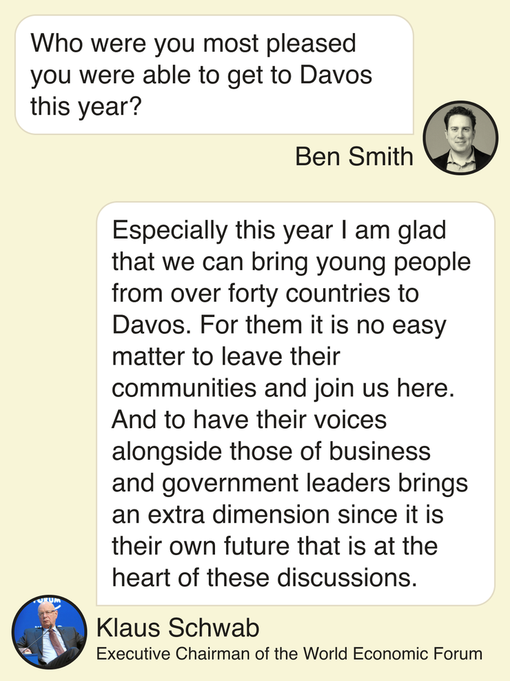 - In The New York Times, Roger Cohen sees reason for optimism about Davos’s mission at a difficult time: “The world that will be debated in Davos is sobered but not stripped of the idea that the pursuit of human dignity and equal opportunity are the necessary accompaniment to the pursuit of profit.”