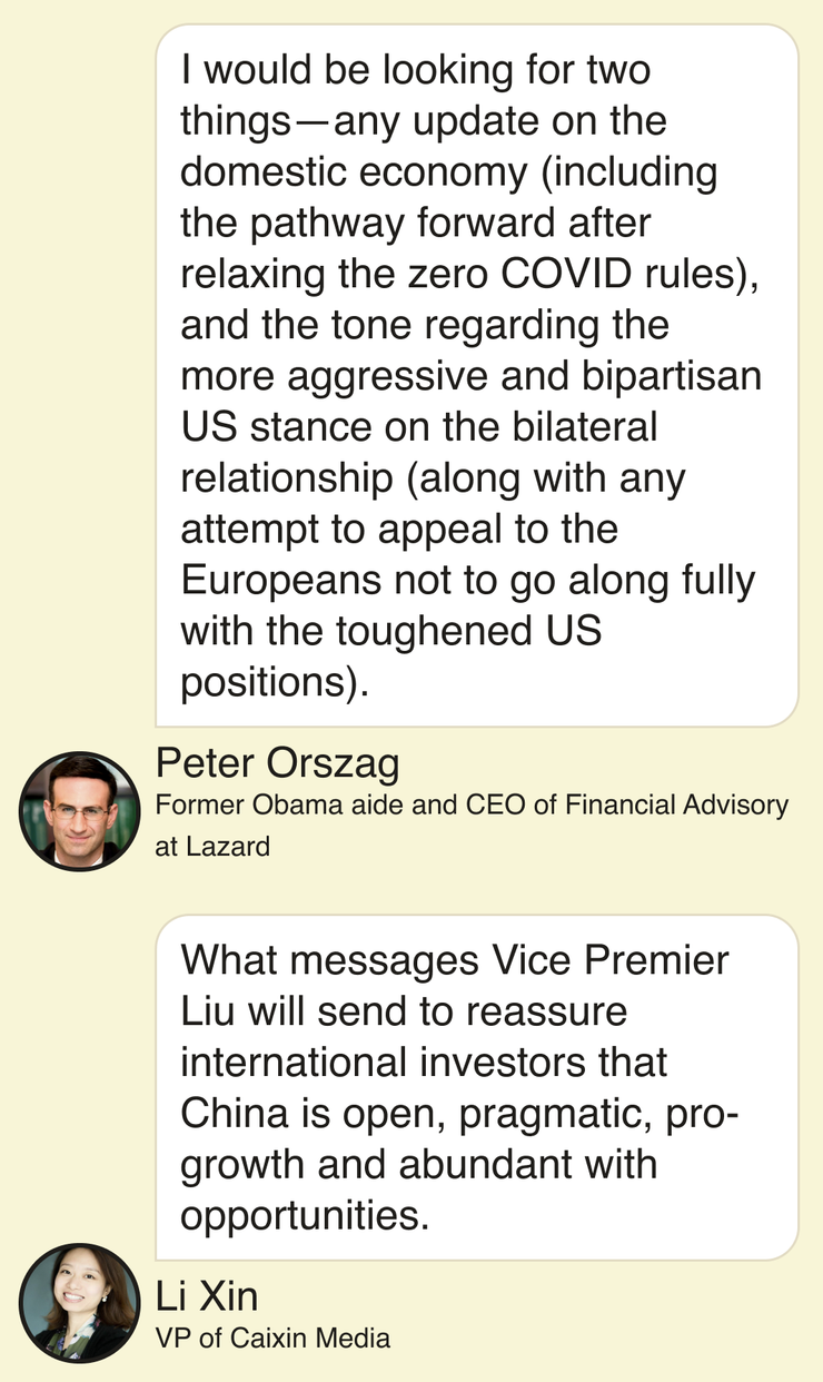That’s unlikely to shift America’s deeply anti-China domestic politics. But with Vice Premier Liu He set to speak Tuesday, I asked a couple of close observers — Peter Orszag and Li Xin — what they’d be listening for: