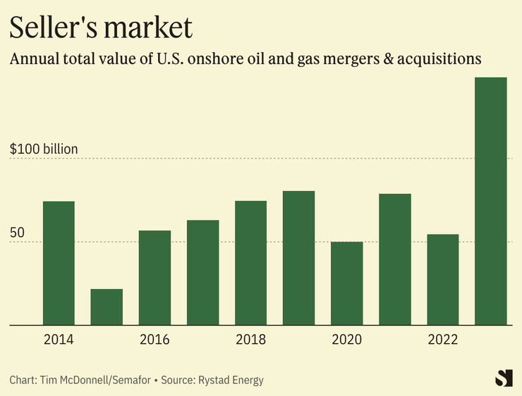 The biggest oil and gas producers are flush with cash after a couple of highly profitable years, but are under pressure from their shareholders not to plow that money back into new production. As companies like ExxonMobil and Chevron plan for their existing wells to run low and oil demand to decline, and with few untapped resources left, the most cost-effective way to maintain market share has become to acquire a smaller rival and run its wells more efficiently. Gas companies are under similar pressure to find efficiencies, especially because gas prices have fallen since the energy crisis triggered by Russia’s full-scale invasion of Ukraine. Recent big deals include Exxon’s acquisition of Pioneer Natural Resources and Chevron’s purchase of Hess, both in October, as well as APA’s acquisition of Callon Petroleum on Jan. 4, along with numerous other small deals, mostly in the Permian Basin.
