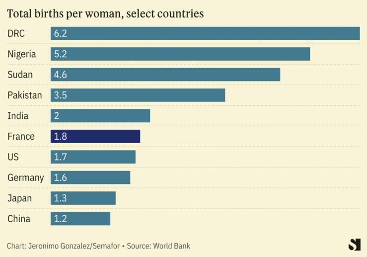 These trends are not unique to France — births are declining globally. In 2000, the world’s fertility rate stood at 2.7 births per woman. The “replacement rate,” at which a population is stable, is 2.1. As of 2023, the rate was 2.3 — and falling.