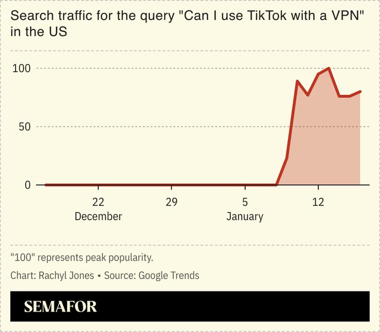 If TikTok shuts down its US services on Sunday, some Americans will likely turn to virtual private networks, or VPNs, which replace a device’s IP address with one from another location. Internet searches that include the words “TikTok” and “VPN” have skyrocketed in the last week, Google Trends shows. The hope is that logging into TikTok, which Washington sees as a national security threat because of its Chinese ownership, from an IP address associated with another country would allow users to access their content.