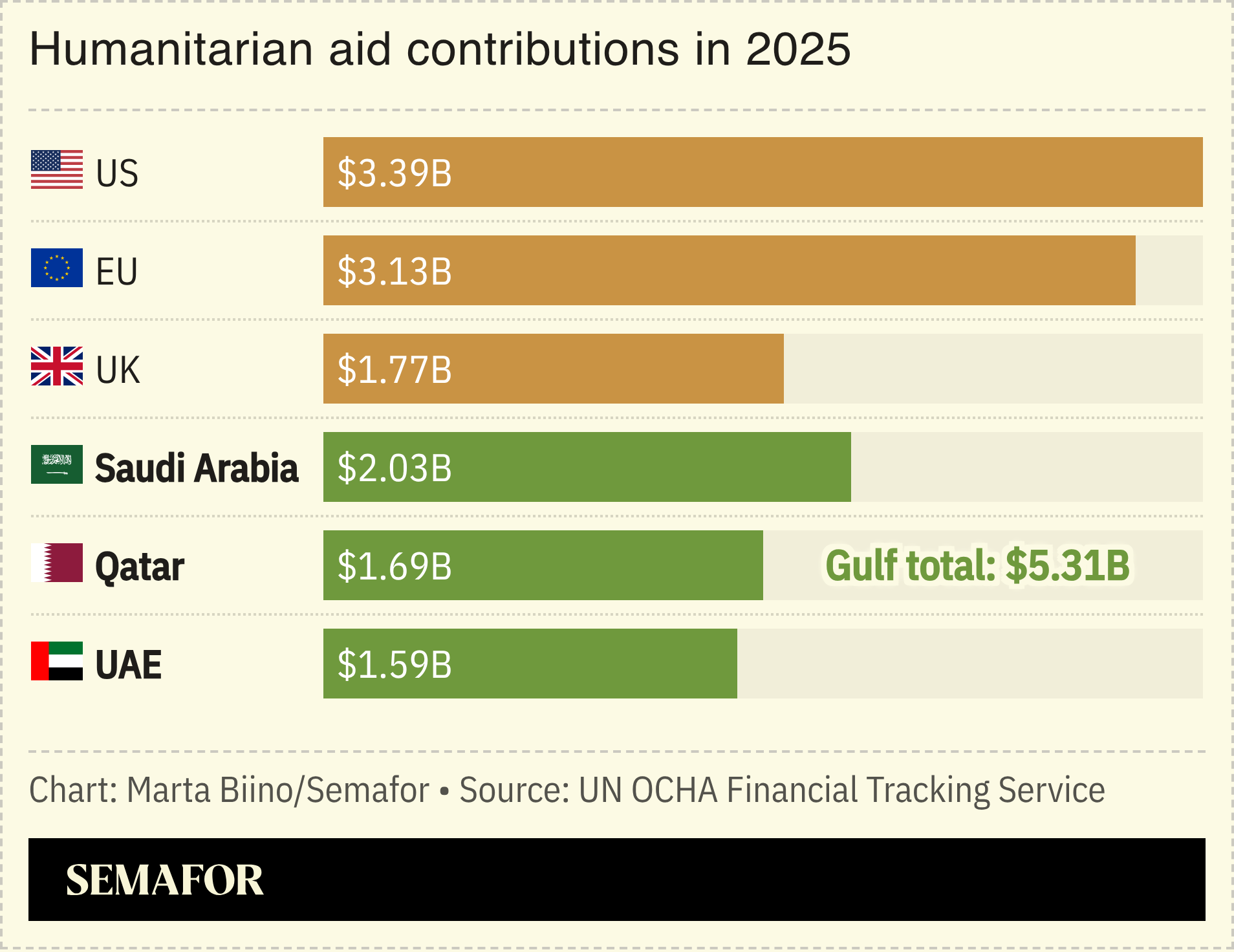 When combined with assistance from Qatar and the UAE, the Gulf trio’s giving last year exceeded that of the US, despite the latter having an economy almost 20 times bigger.