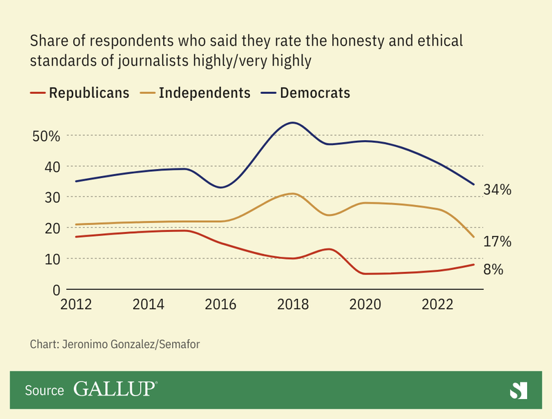 Democrats are losing faith in journalists, a new survey from Gallup found. As of last year, just 34% of Democrats reported viewing journalists’ as having “high” or “very high” honesty and ethical standards; that number has been on a steady decline since its peak of 54% in 2018.