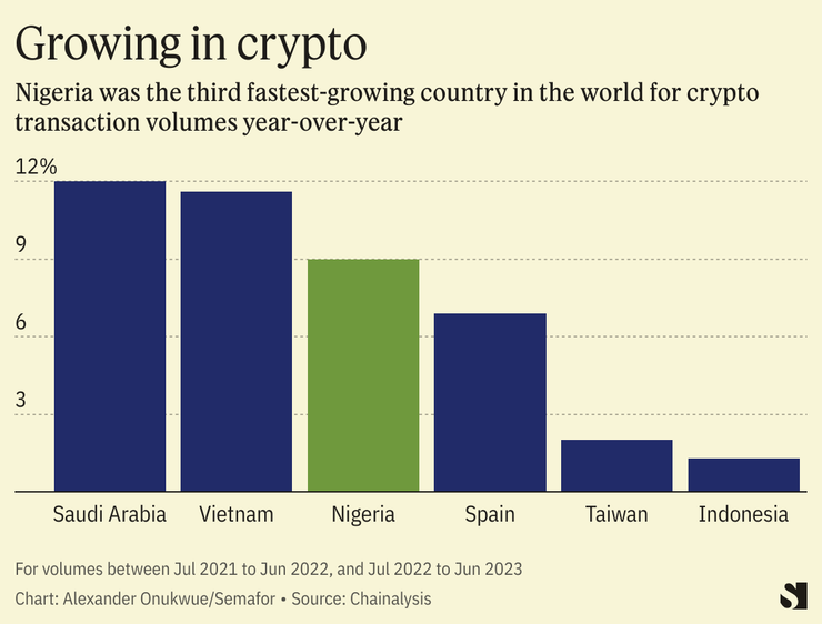 Sub-Saharan Africa received only 2.3% of the value of global crypto transactions between July 2022 and June 2023, according to blockchain analysis firm Chainalysis. But that share was worth $117 billion and most of it came from Nigeria which Chainalysis ranked second on its global crypto adoption index. Nigeria’s 9% annual growth in crypto transaction volume by mid 2023 was only surpassed by Saudi Arabia and Vietnam.