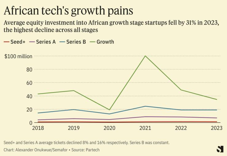 But “growth stage tickets are mostly driven by large global VC players,” Tidjane Deme, general partner at Partech, told Semafor Africa. The withdrawal of those big-ticket firms like Tiger Global, Softbank, and affiliates of Sequoia Capital resulted in a hit on African growth startups, he said.