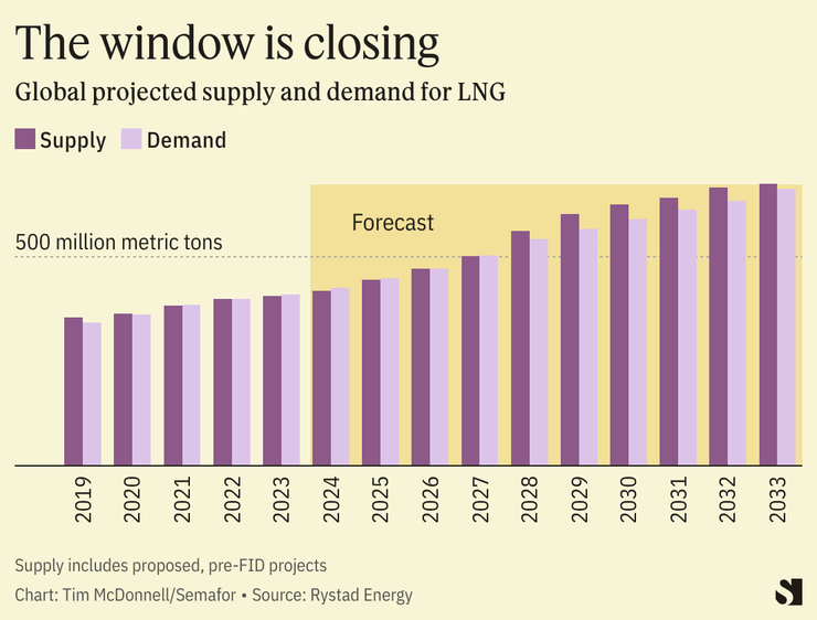 “When we hit a supply glut, which we expect by 2025 regardless of the approval process, new contract signing will slow significantly,” Samantha Dart, head of natural-gas research at Goldman Sachs, told me. “The window of opportunity for more final investment decisions to be reached is about to close.”