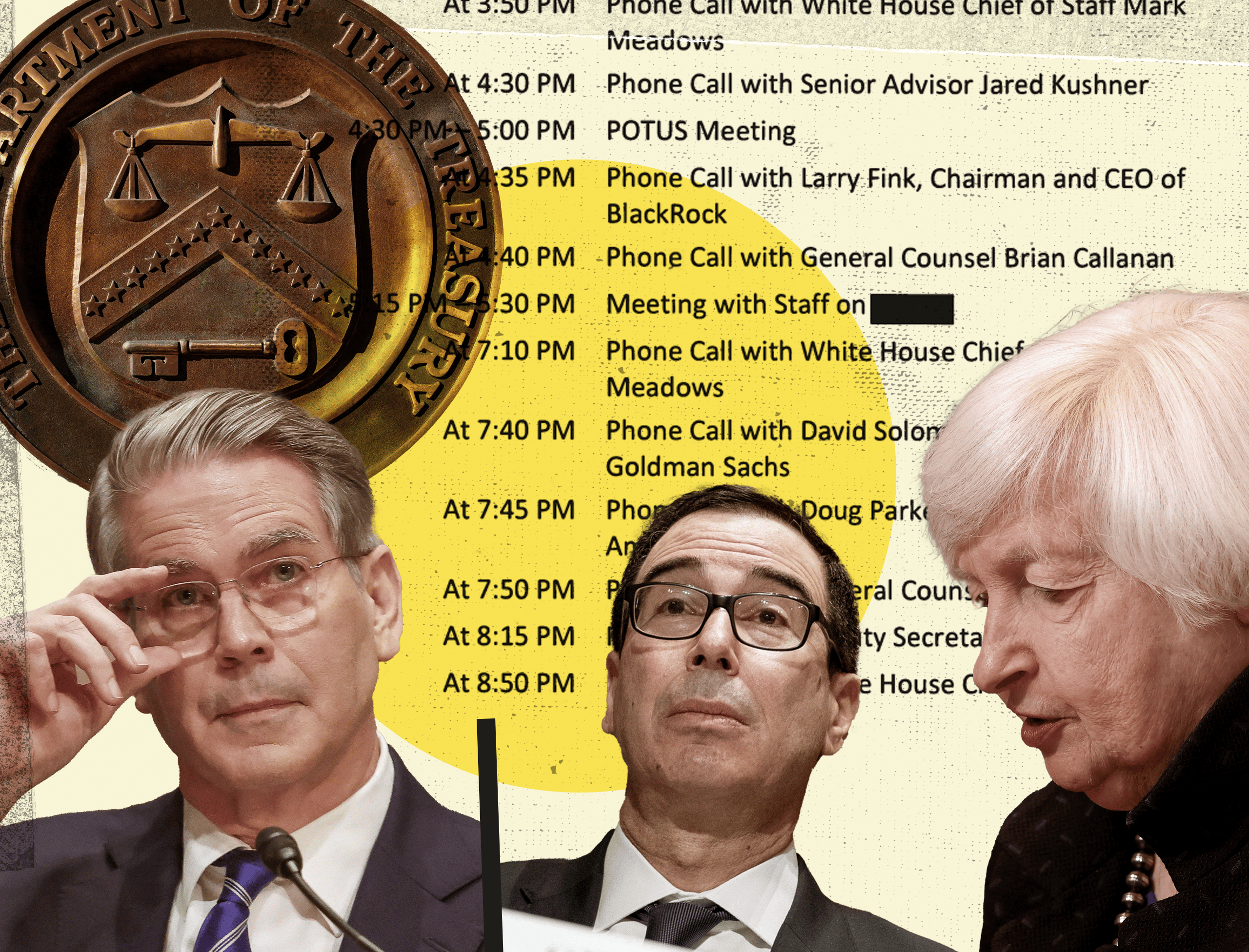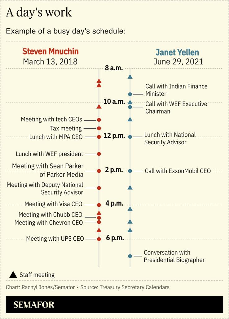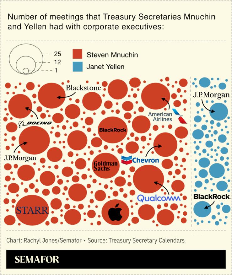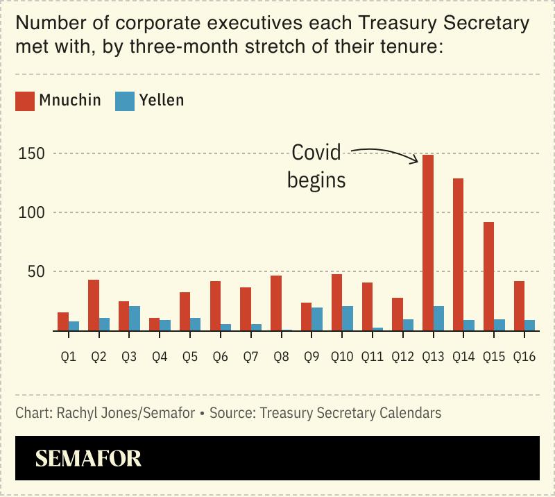 Semafor reviewed more than 1,200 pages of Secretary Mnuchin’s and Secretary Yellen’s publicly available calendars, which include official meetings and discussions. The data captures one-on-one engagements as well as those with a few executives present. It doesn’t include events where the Secretaries addressed large groups of executives, such as trade association meetings, and may not capture sporadic encounters that aren’t retroactively added to the schedule.