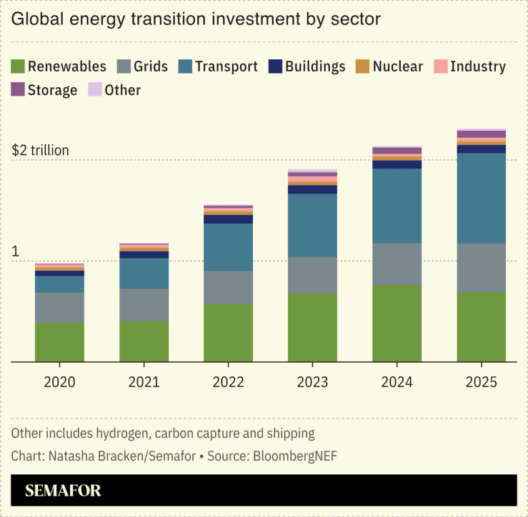 Even investments in the US rose 3.5%, despite policy rollbacks, trade restrictions, and broader tensions. More spending is on the way: BloombergNEF projects annual investment in the energy transition worldwide will grow to $2.9 trillion in five years.