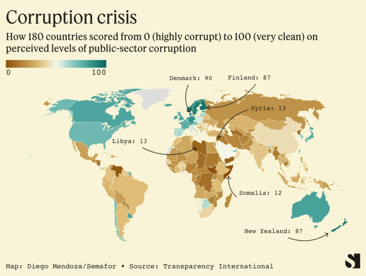 The organization’s annual Corruption Perceptions Index, released Tuesday, ranked 180 countries and territories by measuring their perceived levels of corruption in the public sector, with a score of 0 indicating a highly corrupt government and a score of 100 indicating a very clean government.