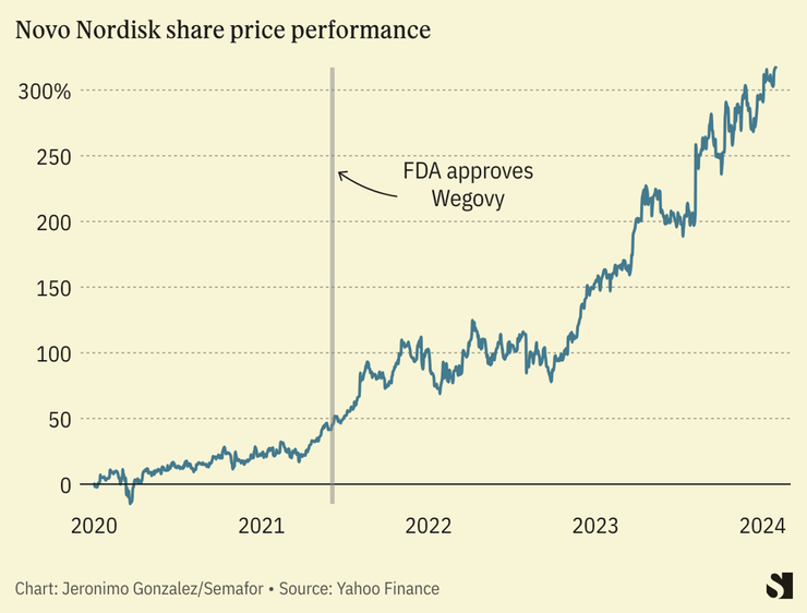 Danish pharma giant Novo Nordisk reported its highest annual profit in decades last year — a 51% jump from the year prior — driven by sales of its blockbuster weight-loss drug. Wegovy, also sold as a diabetes treatment under the name Ozempic, has become highly sought-after, securing Novo Nordisk’s place as Europe’s biggest drug company with a more than $500 billion market capitalization. Ozempic alone accounted for 41% of Novo’s total sales in 2023.