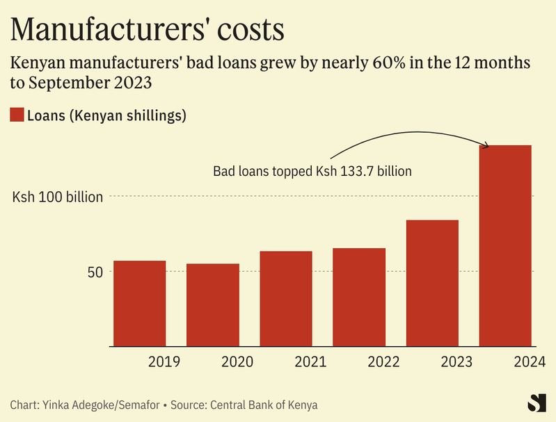 → Are these problems showing up anywhere? Notably, manufacturers also accounted for the lion’s share of defaulted loans in Kenya in 2023 according to new data from the country’s central bank. The sector’s bad loans grew 59.2% to $833 million in the year to September 2023.