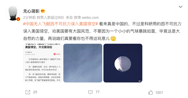 Chinese social media users supported the government’s claims the balloon’s drift to U.S. airspace was merely an accident. Online, some poked fun at how Americans responded with fear and alarm.