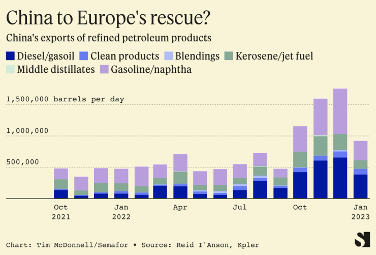 China could come to Europe’s rescue. The country’s exports of refined products hit a record high in December, in response to a government export quota meant to stimulate the economy while domestic demand remains low. That helped Europe top up its diesel storage tanks in advance of Sunday’s EU action. Depending on the pace of China’s post-pandemic re-opening, it could have more diesel to spare. But Beijing will need to be careful about how much cheap Russian crude it imports at the risk of violating purchase contracts with Saudi Arabia and other Gulf producers.