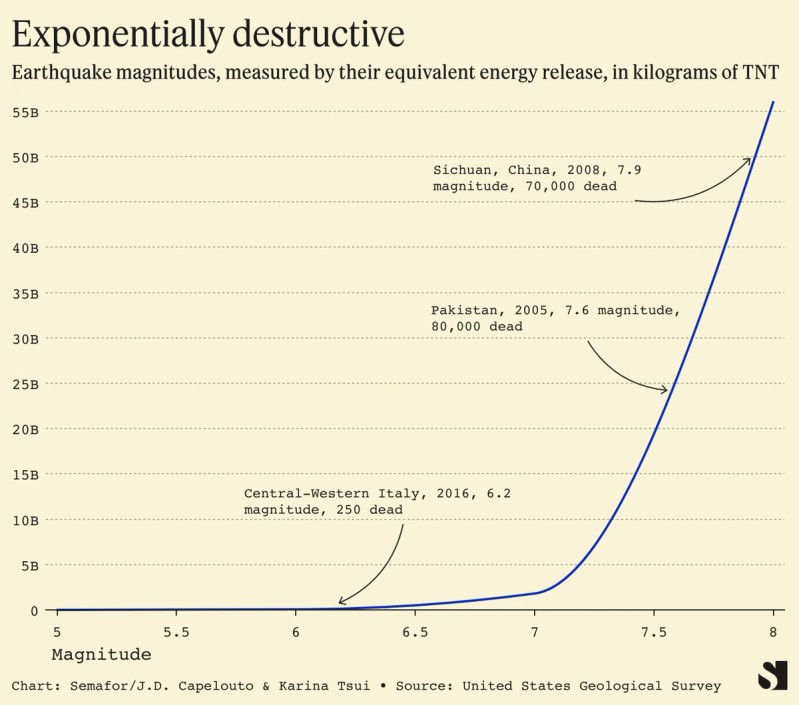 The earthquake measurement system used by the USGS, a version of which was first developed by Charles Richter in the 1930s, shows why a 7.8-magnitude earthquake is so much worse than even a 7.0 rumble.