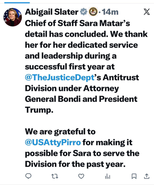 Gail Slater declined to renew the expiring contract of her chief of staff, Sara Matar, before being told by Bondi that she didn’t have the authority to do so, people familiar with the matter said. Slater posted on X Friday that Matar’s “detail has concluded” and then later deleted the post. Matar’s detail has been extended, a person familiar with the matter said.