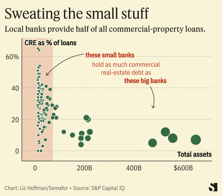 Commercial mortgages account for, on average, 3% of the assets at the 10 biggest banks in the country. At the next 150 banks, it’s almost 20%. Local banks routinely have half of their customers’ deposits tied up in mortgages for office buildings, hotels, and malls.