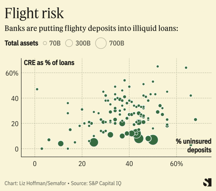 The deposits these banks rely on are a flight risk because more of them exceed the government’s $250,000-per-account insurance limit. As we saw last spring, uninsured deposits are the first to go, which can quickly leave banks insolvent.