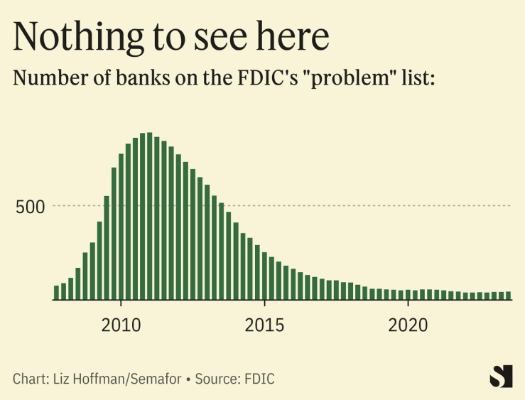 There’s also a chance this is more idiosyncratic. Banks have bucked apocalyptic predictions about collapsing margins. The profits they make between what they pay for deposits and what they earn on loans has held surprisingly steady, and the number of banks on the FDIC’s watch list is near record lows.