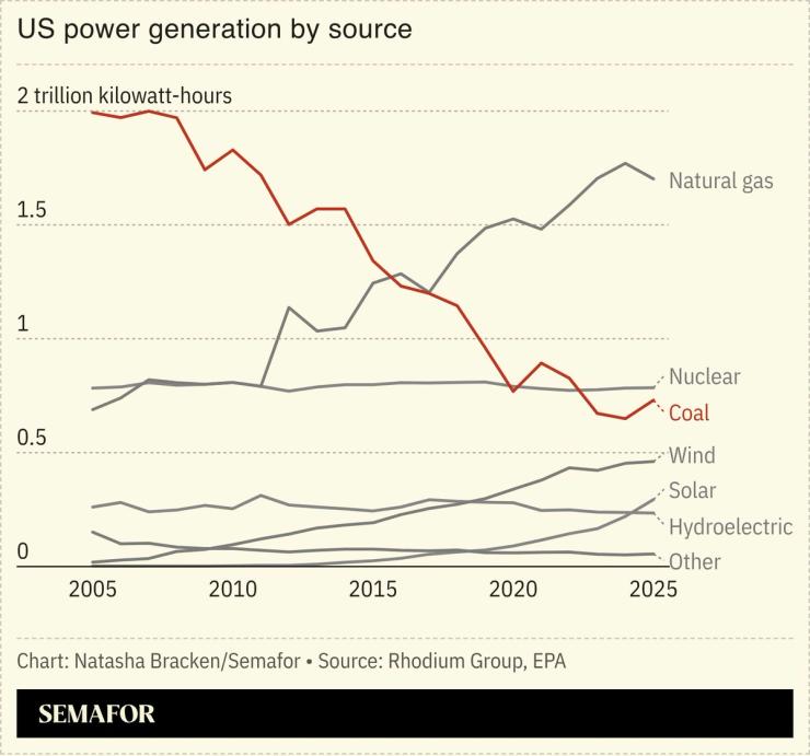 The announcements follow a string of moves by the administration to revive the fossil fuel under an “energy emergency,” including the Energy Department’s allocation of $625 million to help reinvigorate the struggling industry, and the Interior Department’s decision to open more federal land for coal leasing. The enthusiasm has spread beyond the White House: The nation’s largest public utility announced this week it would keep two large power plants open in Tennessee that had been slated for retirement within two years. Beyond reviving dormant coal plants, Trump is also easing the path for coal by dismantling federal policies that raised its costs (he is expected to announce today the end of the endangerment finding), while eliminating tax incentives for renewables.