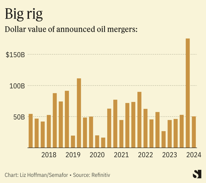 Similar dynamics are behind a spate of takeovers in the area, including Exxon buying Pioneer for $60 billion, Chevron buying Hess ($53 billion), Chesapeake buying Southwestern ($7.4 billion), and Occidental buying CrownRock ($12 billion), all announced in the past four months.