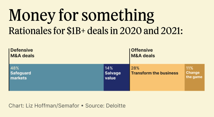 It’s odd that dealmaking has become associated with boom times because it’s the textbook solution to the problem now facing the oil industry. Most corporate mergers over the past few years have actually been defensive, according to Deloitte, and one in every seven is just trying to squeeze whatever remains from a dying corner of the corporate world.