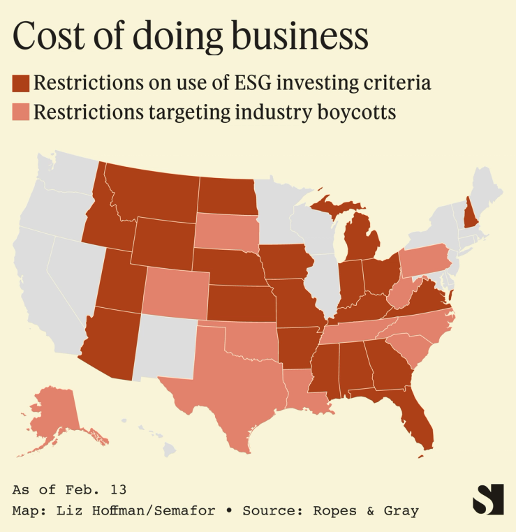 Last year, Republican-controlled legislatures began passing laws blacklisting state investment funds from doing business with money managers that pushed what they deemed to be liberal agendas, like boycotting gun manufacturers and mining companies. BlackRock, run by Larry Fink, an outspoken supporter of so-called ESG principles, has taken the brunt of the pressure, with at least 10 states pulling their money from his firm or threatening to.