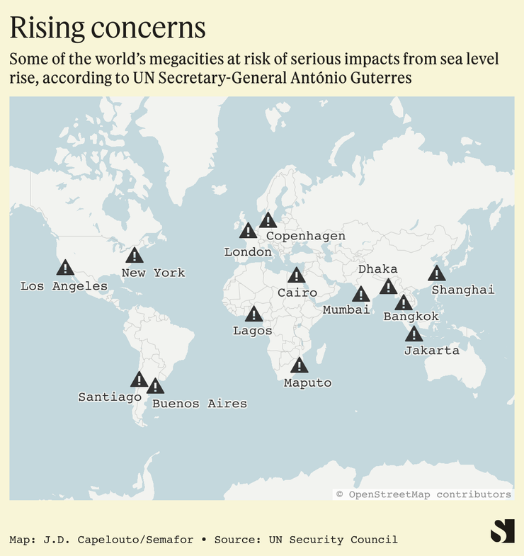 Some of the world’s busiest and biggest cities, including New York, Cairo, Mumbai, Jakarta, Shanghai, Copenhagen, London, Bangkok, Buenos Aires, Lagos, and Los Angeles, are at risk of being flooded if global temperatures continue to creep up and cause further sea level rise, UN Secretary-General António Guterres warned Tuesday.