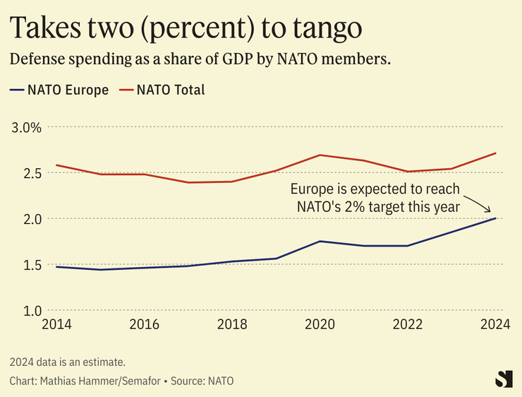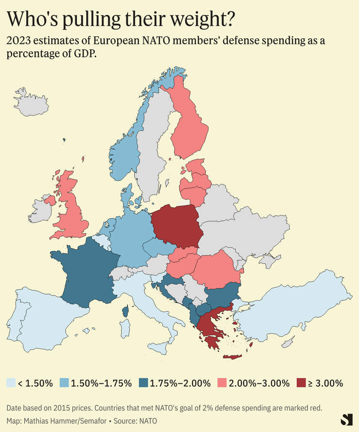 Trump’s repeated attacks on NATO have left Europe more uncertain than ever about the future of the defensive alliance. Polish Prime Minister Donald Tusk called the comments “a cold shower,” while pointing out that his country spent more than 4% of GDP on defense. “We need a second life insurance, not in substitution to or against NATO but in addition,” France’s foreign minister warned. While European leaders have called on the continent to prepare for a possible future without U.S. military assistance, the CEO of Germany’s biggest defense firm, Rheinmetall, told the BBC that Europe will need 10 years to prepare for any serious conflict.