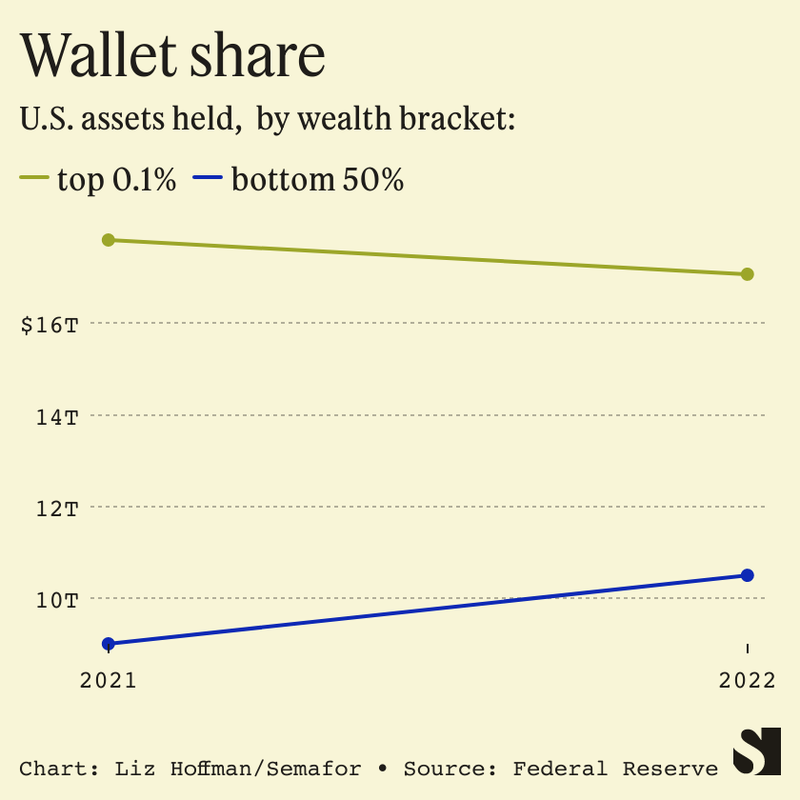 For the first time since 2002, the wealthiest households got poorer last year, while the poorest ones got richer, according to Federal Reserve data, which goes through the third quarter of 2022. The drumbeat of Silicon Valley layoffs won’t make a dent in the Federal Reserve’s fight to cool an economy in overdrive, but they are a harsh reckoning for the office set.