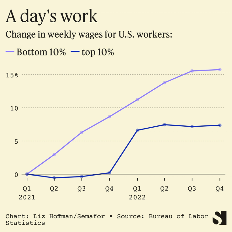 The bottom 10% of U.S. earners, who make $28,000 a year on average, saw their wages rise 10% in 2022, while the weekly pay of the top decile, whose income averages $130,000 (though that may feel like middle class to New Yorkers), has flatlined since last summer in the face of rising inflation, according to Labor Department data