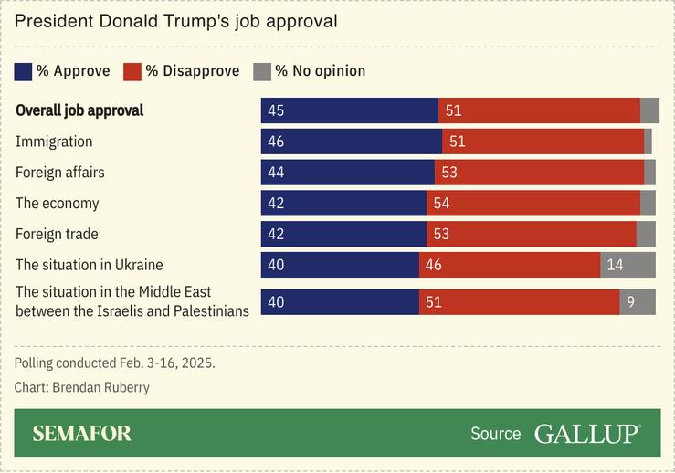 US President Donald Trump’s approval rating slipped slightly in February, falling two points to 45%, according to a Gallup poll released Wednesday.