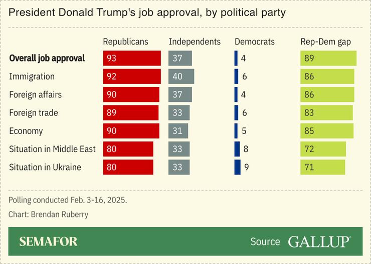 Trump’s first month blitz of executive orders and policy changes designed to reshape the US government has deepened electoral divisions: While 93% of Republicans approved of Trump’s performance ,according to the poll, only 4% of Democrats and 37% of independents concurred. The 89% partisan gap is the highest that Gallup has recorded during any presidency.