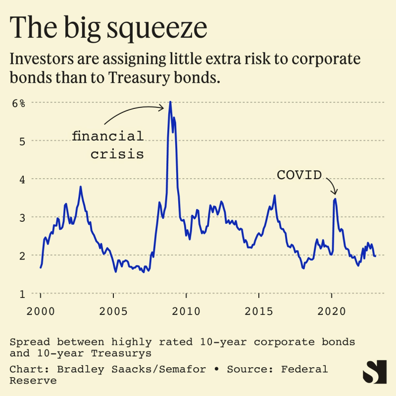 But the 10-year Treasury is going to be at 4.5%. And you’re going to borrow 350 to 400 basis points over that. So when companies refinance, they will have to raise at double the interest rate. Some will have to restructure, either by selling equity or by reorganizing in bankruptcy. I don’t think the market is pricing that in. [Credit] spreads need to widen.