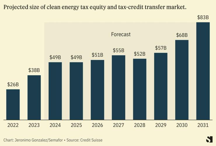 The change was meant to open up the market for tax-credit transfers, widening the available pool of potential investors to corporates as well as financial institutions and growing the overall clean-energy tax trading market, potentially to more than $80 billion by 2031 from around $20 billion now, according to a Credit Suisse analysis. So far, tax-credit transfers remain a small portion of the overall market: Senior bankers at Bank of America and JPMorgan estimated it amounted to $4 billion last year, though that figure is itself remarkable given U.S. authorities only gave detailed guidance on the new system in June. Bank of America’s head of tax equity origination said he expects “to see significant growth in the tax credit transfer market this year.”