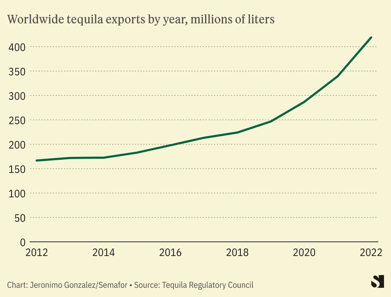 Tequila has been surging in popularity in the U.S. too, with imports more than doubling in the decade to 2022.