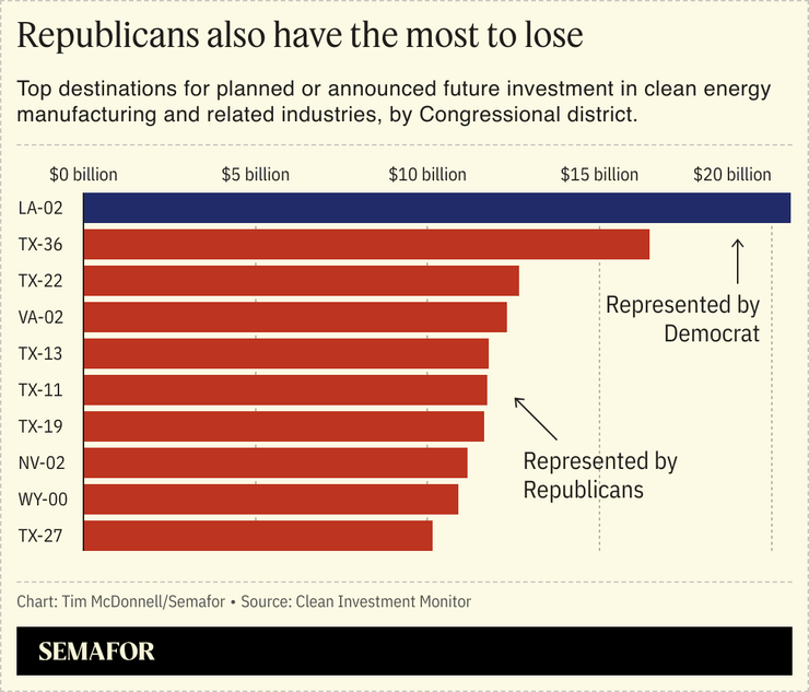 The data also reveal that Republicans have more to lose if they cut off IRA tax credits going forward. Of $524 billion in forthcoming investment that companies have announced, the same share, 77%, is destined for Republican districts, the report found. Many congressional Republicans are already getting an earful from constituents frustrated with Trump’s early executive actions; pulling the rug on one of the country’s few strong sources of job creation seems like a risky bet to make with next year’s midterm elections already looming.
